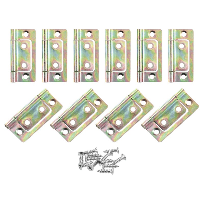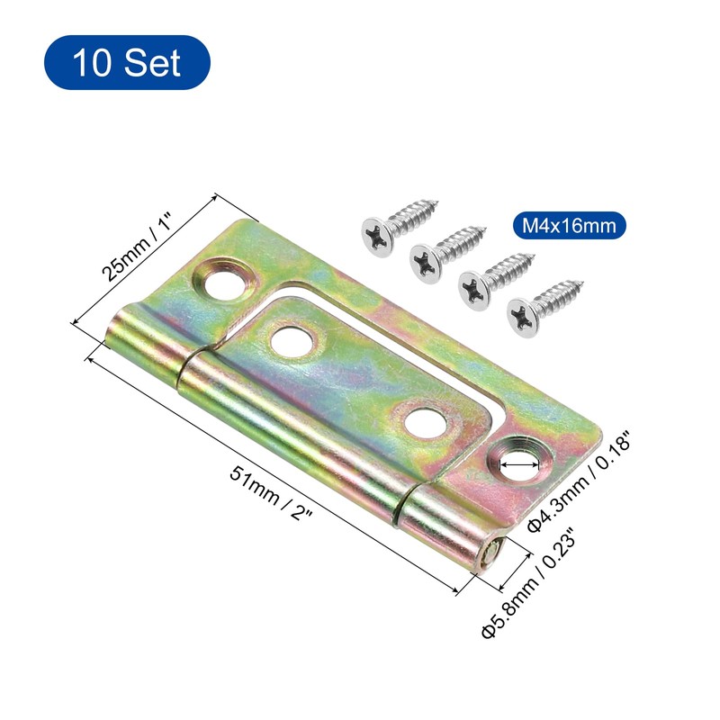 - Specification: Item: Non-Mortise Door Hinges; Material: Iron; Color: Color Zinc; Size:51x25x1.2mm/2x1x0.047inch(LxWxT; Circular hole diameter: 4.3mm/0.17inch; Package Includes 10Pcs x Door Hinges; Stainless Steel M4 x 40 Pcs Screws