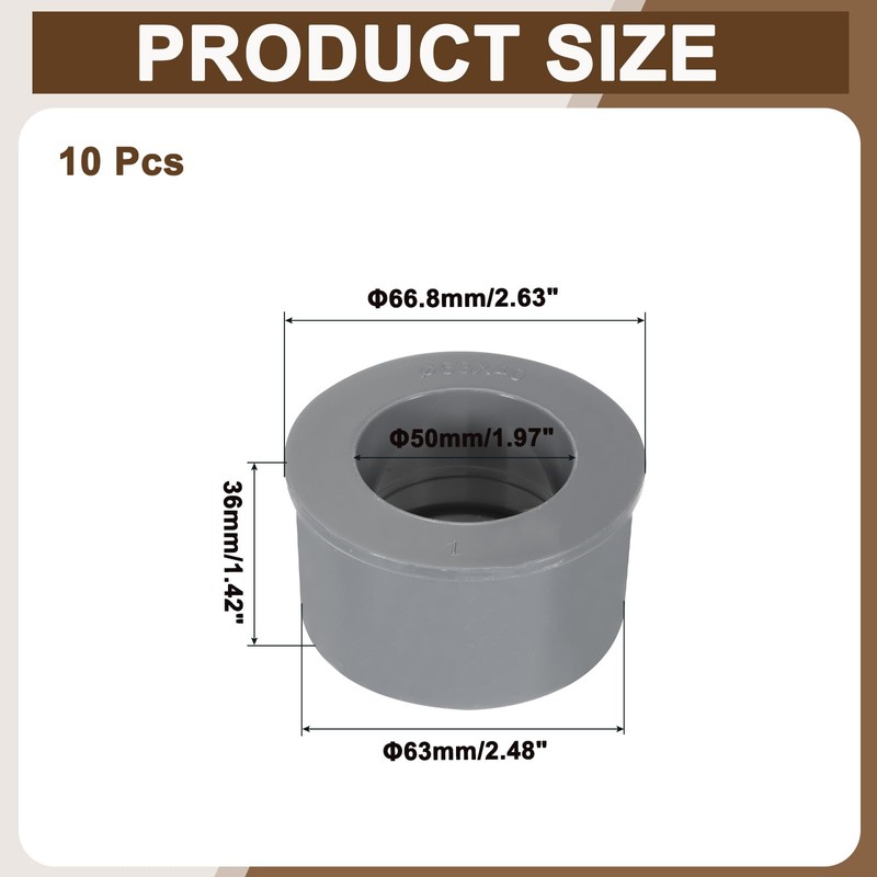 - PVC Reducer Bushing: This package contains 10 PVC Reducer Bushings, one reducer bushing connects to 1-1/2" PVC pipe, the other end connects to 2" PVC pipe adapter, maximum diameter is 66.8mm/2.63", total height is 36mm/1.42", large diameter PVC adapter to small diameter PVC water pipe reducer