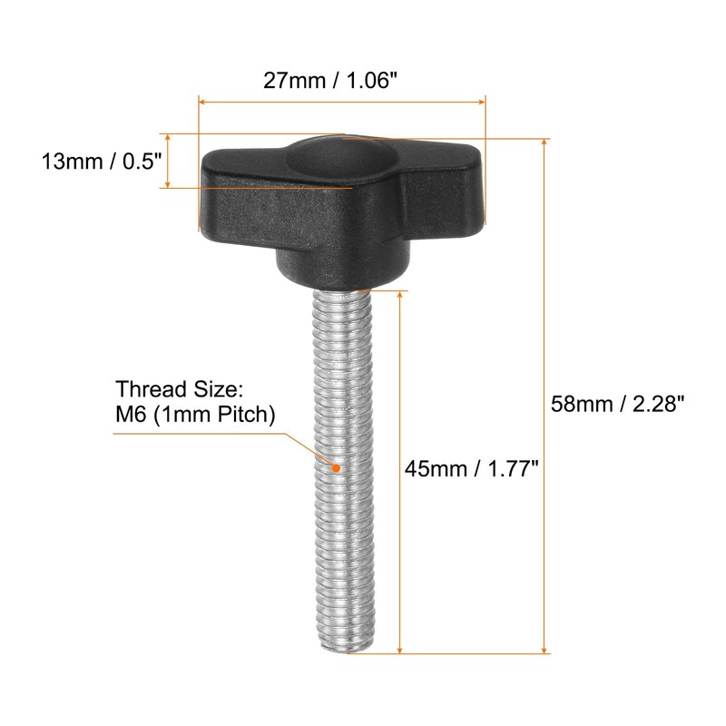 - Size - Standard Female Thread Size: M6 (pitch 1mm); Thread Length: 45mm / 1.77"; Tewing Head Size: 27mm x 13mm / 1.06" x 0.5"; Total Length: 58mm / 2.28"; Knob Style: T/Z; Color: Black (Threads are neat, clear, deep, non-slip and burr-free. )