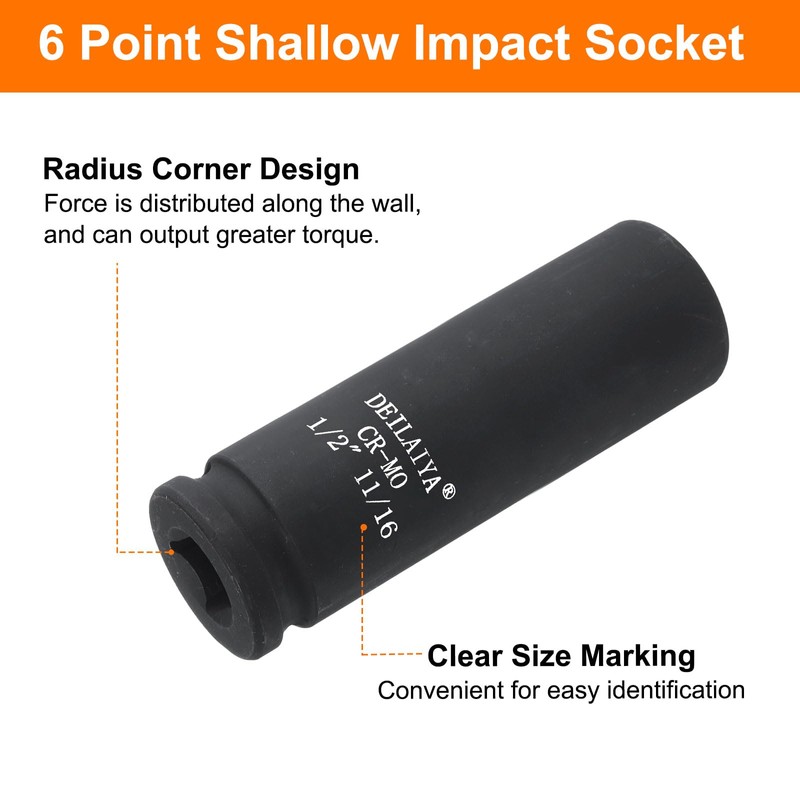 - 【Size】Drive: 1/2-inch, 6-Point Socket Size: 11/16 inch, Total Length: 78mm / 3-inch. The specifications are marked on the surface of the impact socket, which is easy to identify, improving work efficiency.