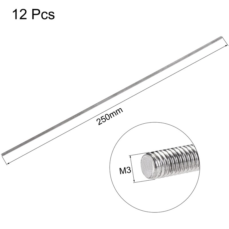 uxcell 12Pcs M3 x 250mm Fully Threaded Rod 304 Stainless Steel Right Hand Threads
