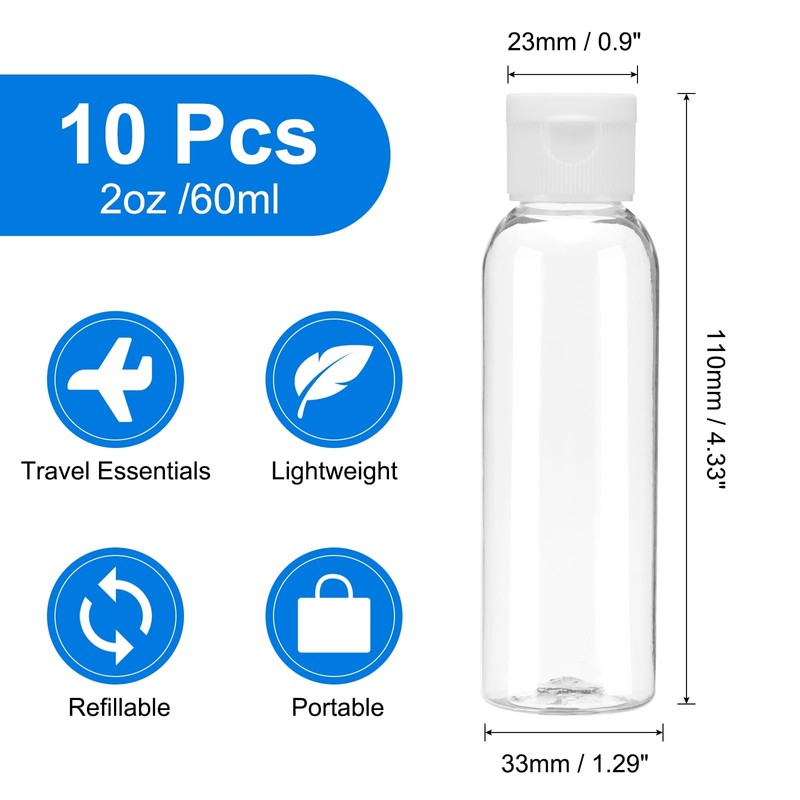 uxcell 2 Oz Plastic Bottles with Flip Caps, 10 Pcs Reusable Travel Size Containers with Lids Plastic Squeeze Refillable Dispensing Bottles for Shampoo, Body Soap, Toner(Transparent White)