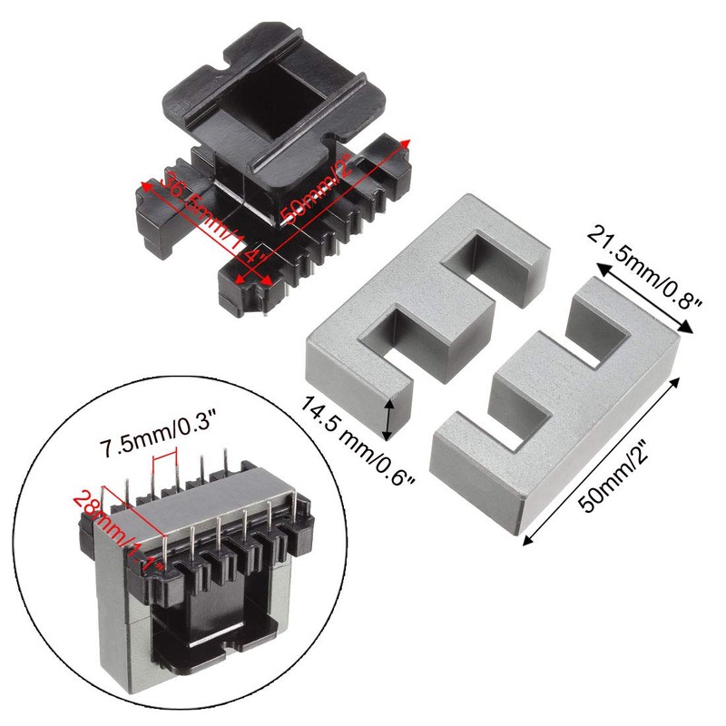- Type: EE50 ; Pin spacing: 7.5mm/0.3''; Row spacing: 28mm/1.1"; Ferrite core Size: 50 x 14.5 x 21.5mm/2" x 0.6" x 0.8"(L*W*T); Bobbin size: 50 x 36.5 x 42mm/12" x 1.4" x 1.6"(L*W*H).