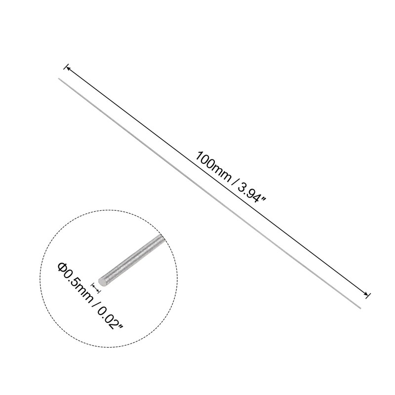 - Round Metal Rods: Diameter: 0.5mm / 0.02"; length: 100mm / 3.94"; hardness: HRC61~63; finish: polished. High-speed steel rod is with combination of hardness and toughness for wear resistance.