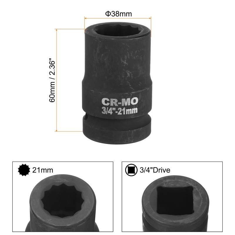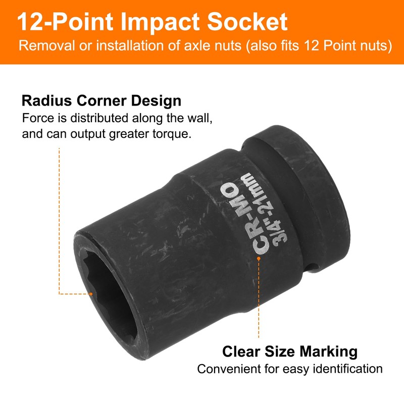 - 【Size】Drive: 3/4-inch, 12-Point Socket Size: 21mm, Total Length: 60mm / 2.36-inch. The size label is laser marked on the socket, making locating and retrieving the socket you need effortless.