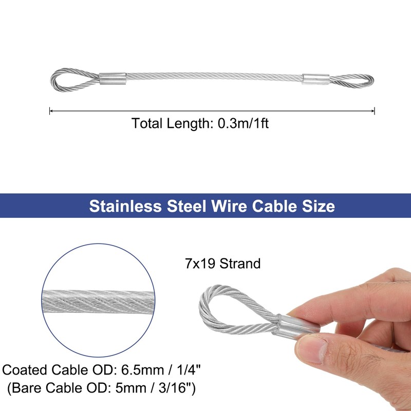 - Cable Wire Rope Size - Bare Cable OD: 5mm / 3/16", Coated Cable OD: 6.5mm / 1/4", Total Length: 0.3m/1ft. The cable has Looped Ends clamped with aluminum sleeves. This stainless steel wire rope has a flexible structure and can be easily cut into many different sizes to meet your needs.
