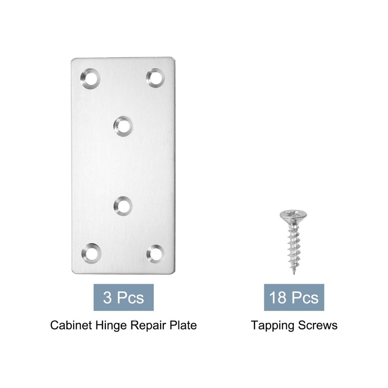 - [Flat Mending Plates] The hole diameter of the cabinet hinge repair plate is 5mm/0.2inch, and the total size is 50x100x1.6mm/2x4x0.06inch(L*W*T), you will receive3 sets kitchen cupboard door hinge repair plate kit; and 6 self-tapping screws each piece.