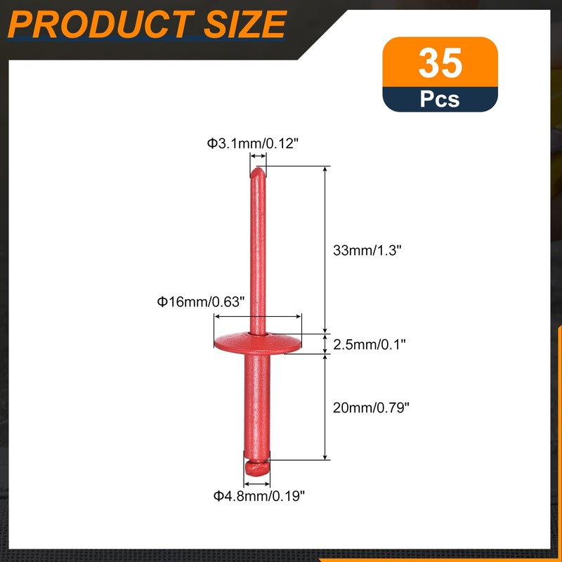 - [SIZE & PACKAGE]: Thickness Of Cap: 2.5mm/0.1"; Diameter Of Cap: 16mm/0.63"; Diameter Of Rivet: 3.1mm/0.12"; Length Of Rivet: 33mm/1.3"; Diameter Of Rivet Body: 4.8mm/0.19"; Length Of Rivet Body: 20mm/0.79"; Riveting Range: 0.47-0.63 inch; Packaging Content: 35pcs x Blind Rivets