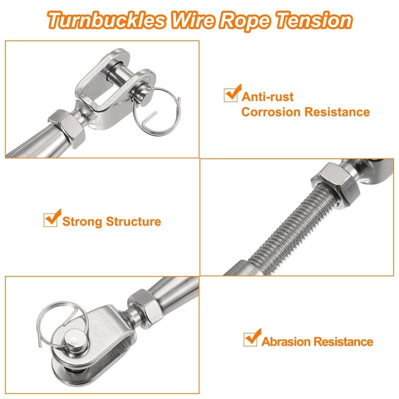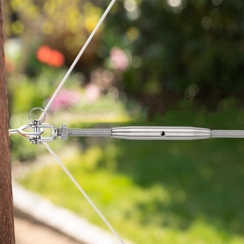 Wide Applications: These 304 stainless steel turnbuckles can be used indoors and outdoors, such as fence wire, sun shade sail, fence, cable railing, clotheslines, picture hanging, tents, home decoration, fishing nets, etc.