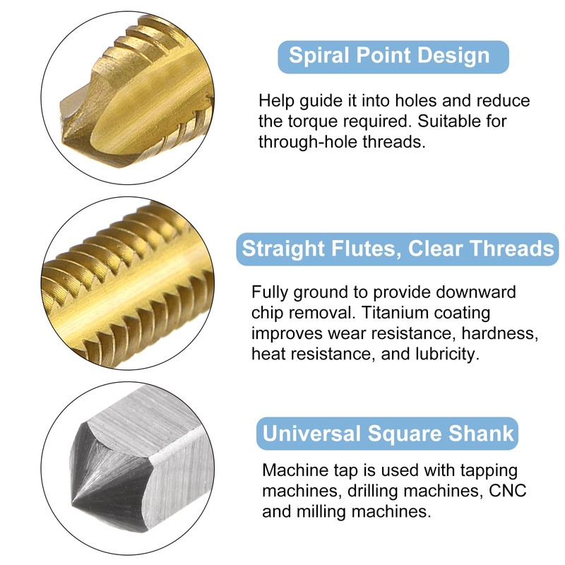 - How to Use: Suitable for drill presses, tapping machines, CNC and milling machines. Used with tapping oil to get higher quality threads and more durable taps. The point of the tap helps guide it into the hole and reduces the torque required to turn it.