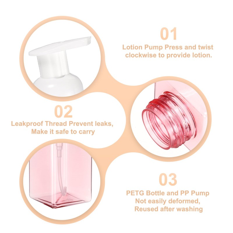 - Leakproof Design: The foaming hand soap dispenser bottle has a screw-on design to prevent leaks, making it safe to carry. Press and twist clockwise to close the pump dispenser bottle, providing even lotion at every press.