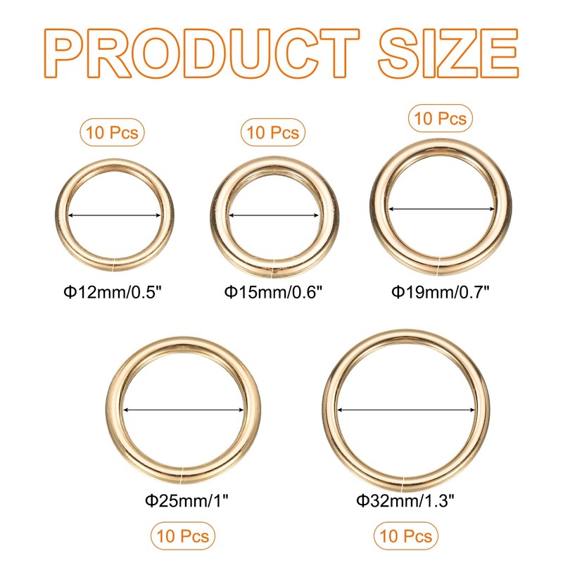 uxcell 50 Pcs O Ring Buckle 0.5"/0.6"/0.7"/1"/1.3" ID 2mm/3.8mm Thickness Zinc Alloy Opening O-Rings Clasp Clips for Crafts Keyrings Bags Straps Belts DIY Accessories, Light Gold