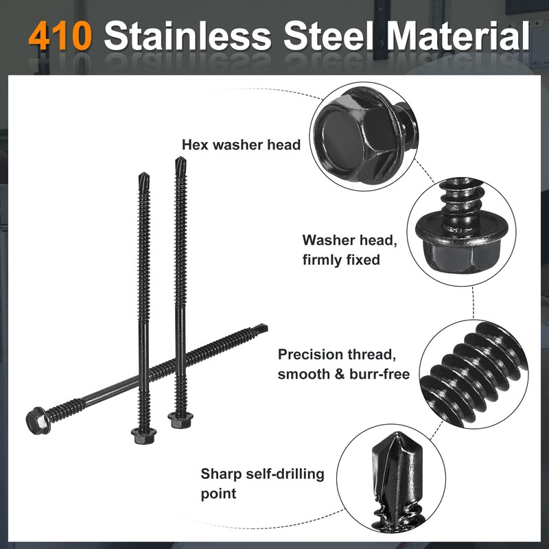 Self-Tapping and Hex Drive - With drill tail, it can drill well into wood, sheet metal, thin sheet, plastic, and other surfaces, the precision thread can reduce the resistance when screwing in and prevent cracking. The washer head helps maintain a secure fit without the need for additional washers, it does not slip easily during installation