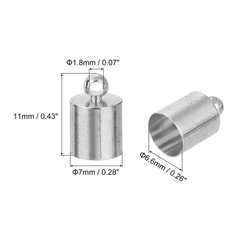 - WHAT YOU GET - You will get 50 pcs of cord end caps to meet your various uses: Color: Rhodium Tone; Ring Hole Size: 1.8mm/0.07-inch; Outer Diameter: 7mm/ 0.28-inch; Inner Diameter: 6.6mm/ 0.26-inch; Height: 11mm/ 0.43-inch