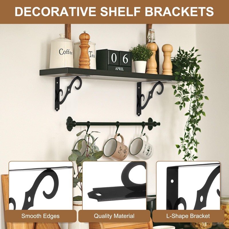 - Wide Application: The decorative shelf bracket is widely used in the kitchen, bathroom, bedroom, office, and other places to store green plants, photo frames, handwork, books, toiletries, storage baskets, sundries, or as support for decorative items and artwork