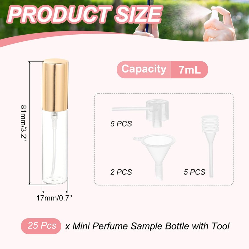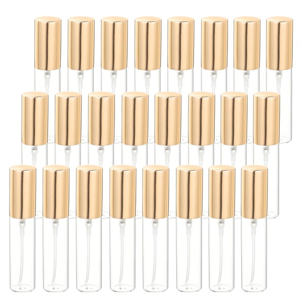 uxcell 7ml Glass Mini Perfume Bottles, 25Pcs Fine Mist Bottles Refillable Empty Mini Spray Bottles with Aluminized Nozzle for Perfume, Travel Liquid, Essential Oil (Clear/Gold)