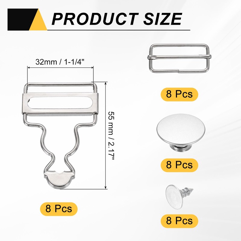 - [Size & Package]: The package comes with 8 sets of overalls buckle with tri-glide slide buckles and buttons, with a size of metal overalls clip in 25mm / 1 inch inner diameter and 52 mm / 2.05 Inch, enough quantity for you to use and replace