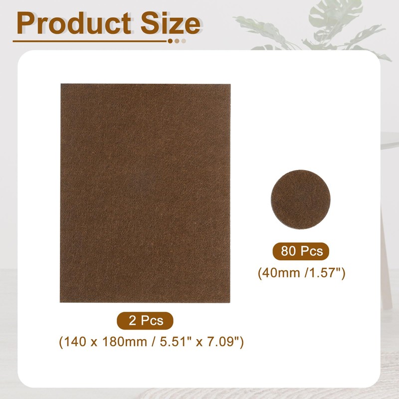 - [SIZE & PACKAGING]: Furniture pads total 82 pieces, consisting of 80 pcs square pads (40mm / 1.57 inch Dia.) and 2 pcs square pads (140 x 180mm / 5.51" x 7.09"). The color is camel, and the thickness is 5 mm / 0.2 inch