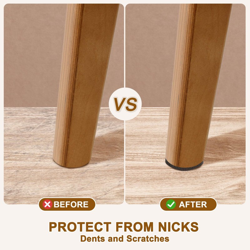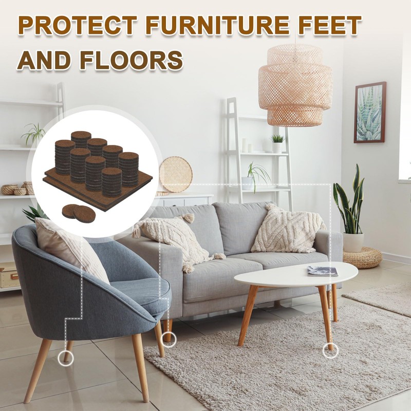 - [MATERIAL]: These furniture pads are made of felt with a sturdy, puncture-resistant felt core in the center that protects against scratches, dents, and scuffs for long-lasting durability The top surface is equipped with a strong adhesive that easily sticks to furniture legs
