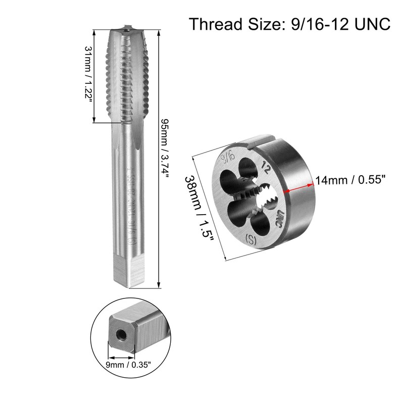 - Tap and Die Set: 9/16-12 UNC thread tap and round die. 38mm (1-1/2") die stock fits 26mm-38mm / M12-M16 capacity, with adjustable screws. Suitable for making or repairing male and female threads. Good for general purpose applications.