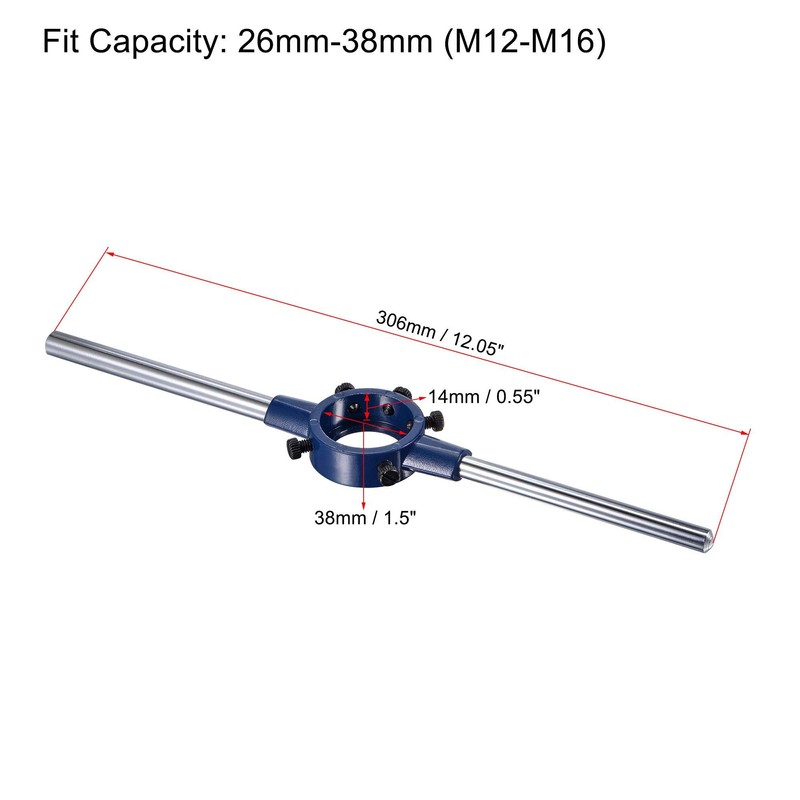 Die Stock: Size: 38mm x 14mm / 1.5" x 0.55" (D*H); Fit Capacity: 26mm-38mm (M12-M16); Overall Length: 306mm / 12.05"; Material: Cast Iron