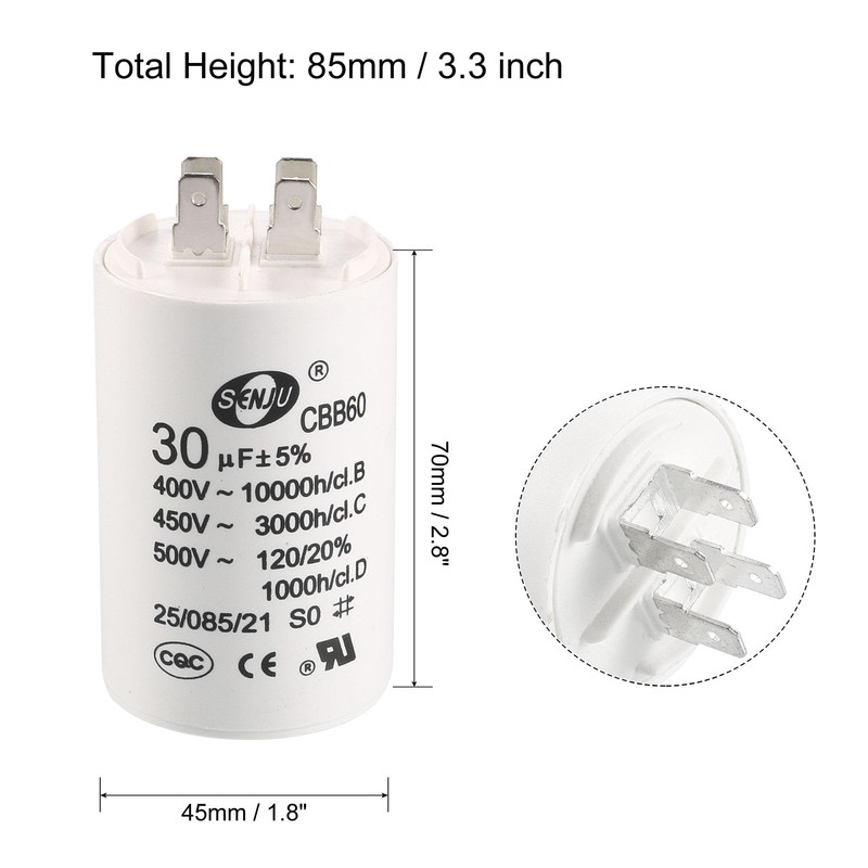 - [Specification] - Rated Capacity: 30uF; Tolerance: ±5%; Rated Voltage: 450V AC; Body Size: 70x45mm / 2.8x1.8 inch (L*D); Rated Frequency: 50/60Hz; Climatic Category: 25/085/21