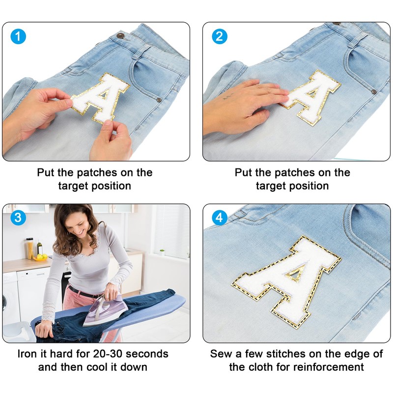 - Installation Instructions: 1) We recommend placing the letter patch in the target position and placing a thin white cotton cloth on top of the cloth sticker. 2) Adjust the temperature of the iron to about 150 degrees Celsius and iron it firmly for 20-30 seconds to cool it. 3) You can also use a needle and thread to sew some stitching on the edge of the cloth