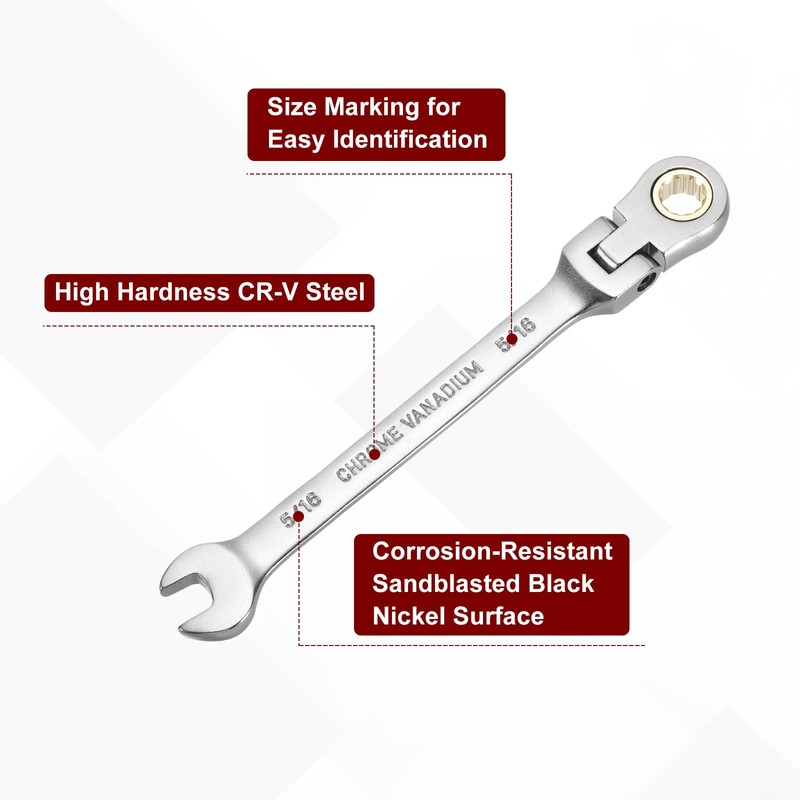 - Size - Specifications: 5/16"; Open Head Thickness: 6mm; Ratchet Head Thickness: 8mm; Total Length: 150mm; Wrench Head Type: Flex Head; Ratchet Type: One Way; Package Includes: 1 x Flex Head Ratchet Wrench