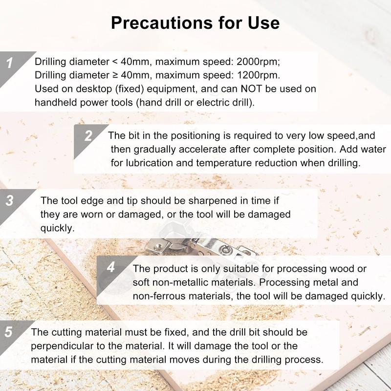 • Tips: Maximum speed: 2000rpm. Used on desktop (fixed) equipment, and can NOT be used on handheld power tools (such as hand drill or electric drill). Can not drill metal and non-ferrous metal. To avoid causing damage, be sure no nails or other metal objects in wood before drilling. The cutting edge and tip of the opener should be sharpened in time.