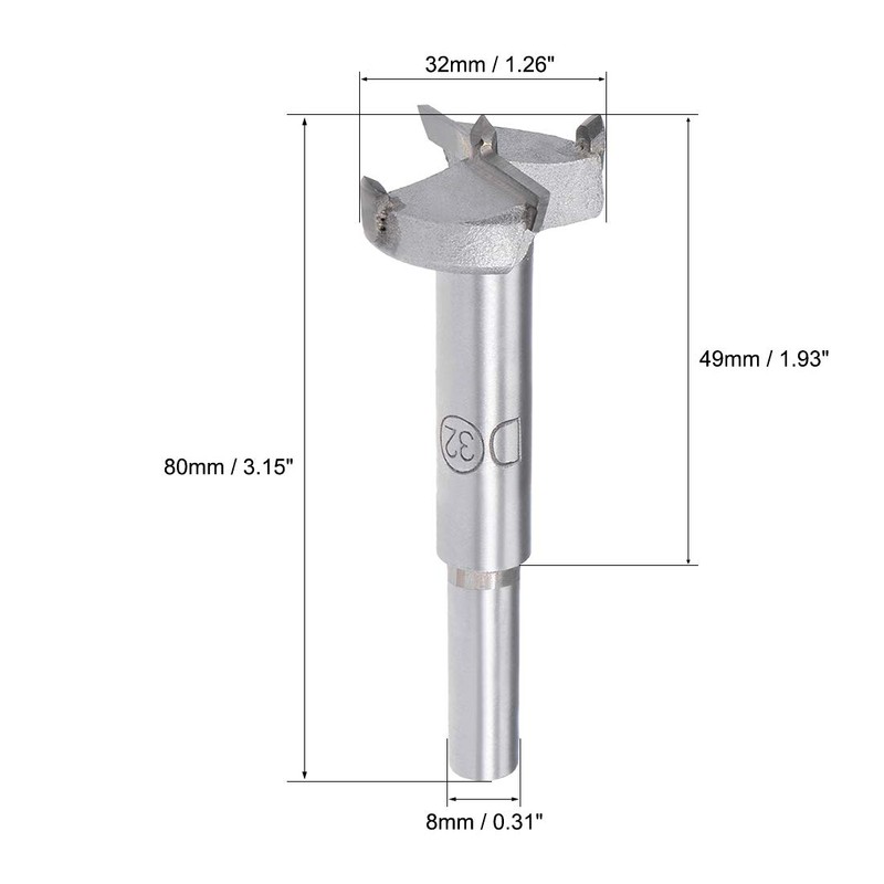 • Forstner Drill Bits: Drilling diameter: 32mm / 1.26"; shank size: 8mm / 0.31"; drilling depth: 49mm / 1.93"; total length: 80mm / 3.15". Thickened and sharp carbide tip, high strength and hardness high carbon steel body, round shank forstner bits for woodworking.