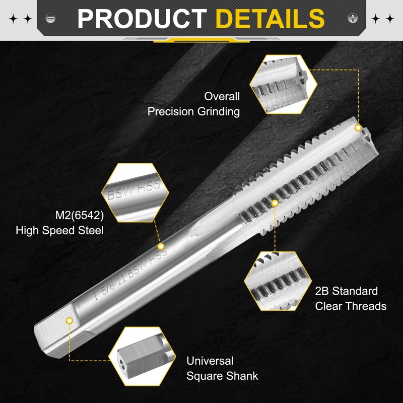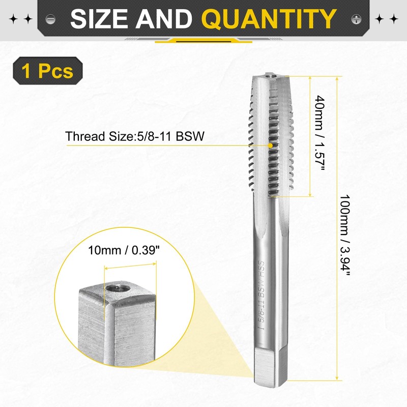 - Hand Threading Tap Size: Thread size: 5/8-11 BSW; total length: 100mm / 3.94"; thread length: 40mm / 1.57"; square end width: 10mm / 0.39"; accuracy class: 2B. Right hand thread cutting, fast tapping with accuracy.