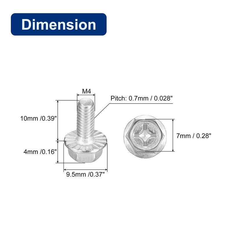 • Product Name : Hex Head Flange Bolts; Thread Size : M4 x 10 mm(D*L); Pitch: 0.7 mm; Hex Head Width: 7 mm; Head Size: 9.5 x 4 mm(D*T); Package Content: 10 x Hex Head Flange Bolts