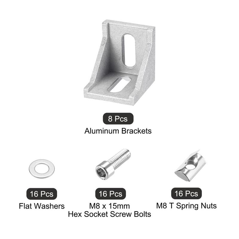 - [Package] - Package of 8 sets: 8 x 4040 aluminum brackets, 16 x M8T spring nuts, 16 x M8 x 15mm hex hole screw bolts. You can use bolts, nuts or washers to install the bracket
