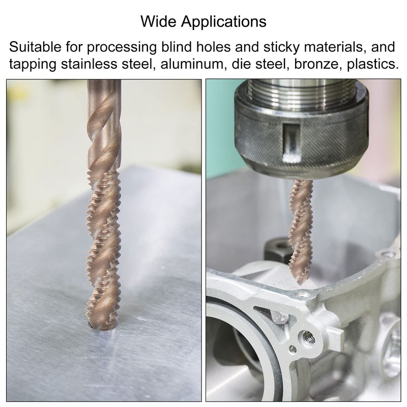 - Spiral Flute Tap: Spiral flute design, upward shaving, right thread cutting, precise and fast tapping Suitable for processing stop holes and adhesive materials, tapping aluminum, die steel, stainless steel, bronze, hard plastic, etc