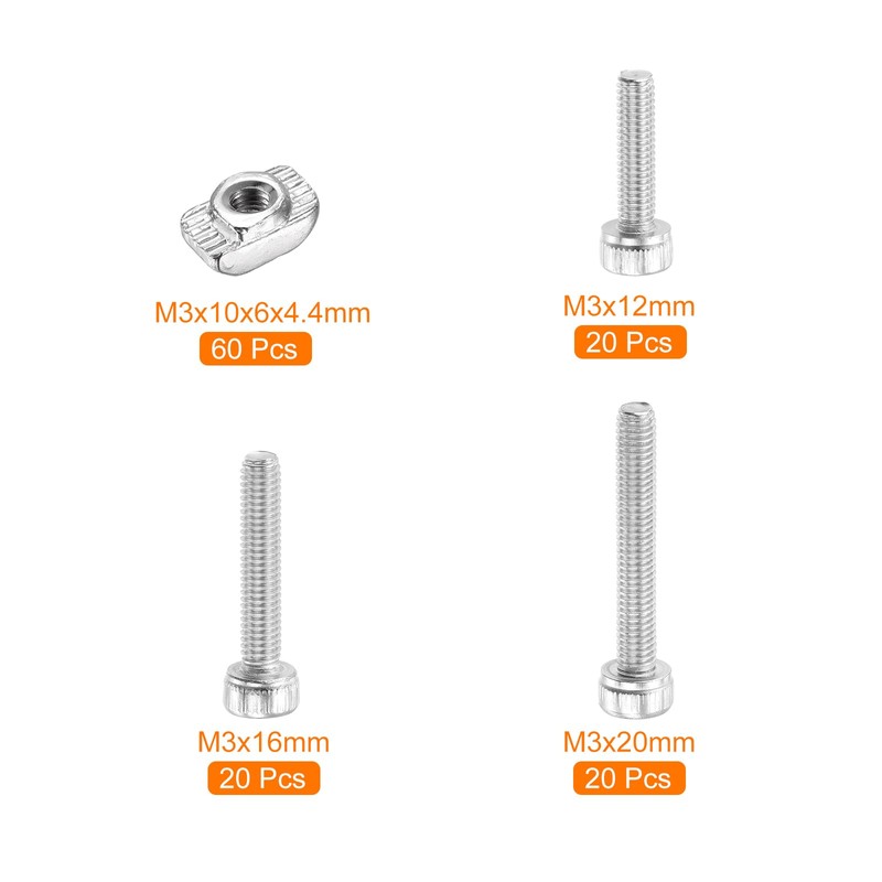 - Specification: Shape: Hammer Head; Material: Carbon Steel; Finish: Nickel plated; Color: Silver Tone; M3 Size: 10x6x4.4 mm / 0.39x0.24x0.17 inch (LxWxT); Package Content: T-nuts: 60Pcs x M3 T Sliding Nuts Hexagonal socket head cap screw 20Pcs x M3x12 20Pcs x M3x16 20Pcs x M4x20