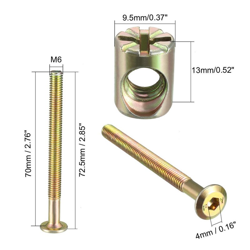 - Strength Grade: 4.8; Main Color: Bronze Tone; Thread Diameter: M6; Under Head Length: 70mm / 2.76"; Thread Length: 58mm / 2.28"; Nut Size: 9.5 x 13mm / 0.37" x 0.52" (D*L); Screw Size: 12.5 x 72.5mm / 0.49" x 2.85" (Max.D*L); Fit Hex Key Size: 4mm / 0.16"