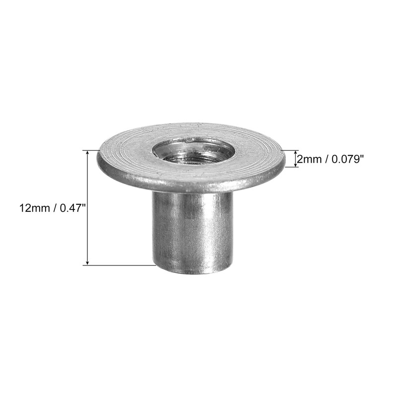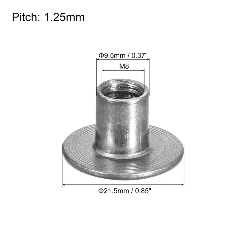 - Female Thread Diameter: M8; Pitch: 1.25mm; Round Base Diameter: 21.5mm / 0.85"; Round Base Thickness: 1.5mm / 0.059"; Total Height: 15mm / 0.59"; Drill Hole Diameter(Rod Diameter of Nut): 9.5mm / 0.37"; Package Content: 12pcs x Tee Nuts