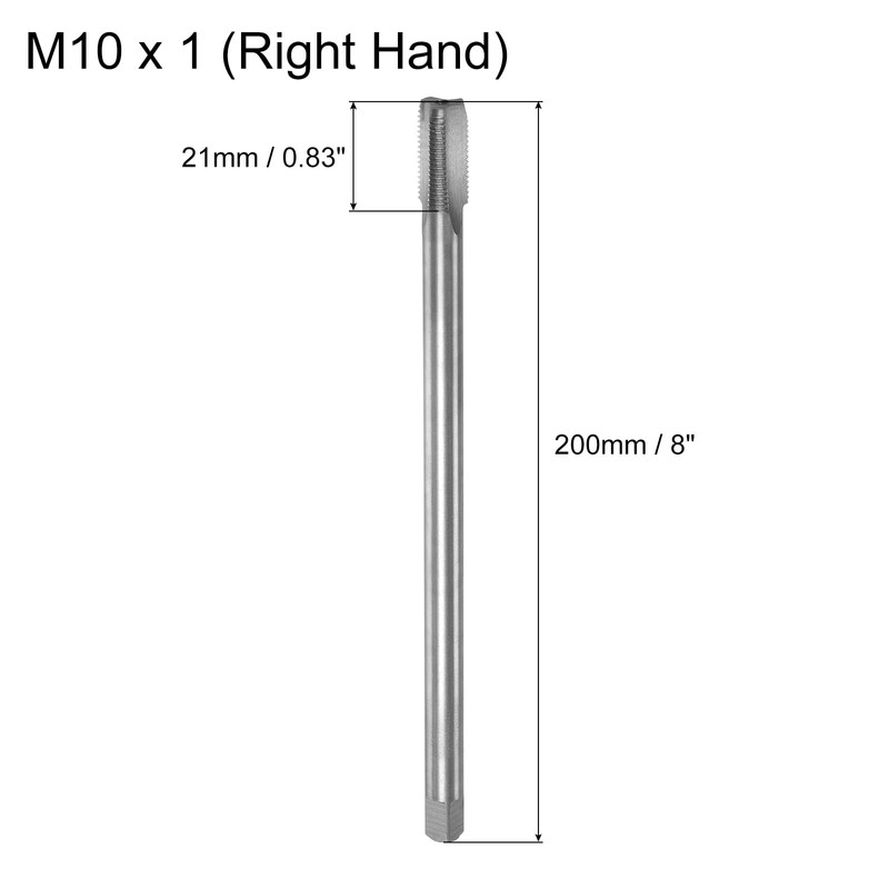 - Metric Thread Tap: Thread size: M10 x 1 (right hand); accuracy: H2; total length: 200mm / 8" (extra long); square shank width: 6mm / 0.24"; thread length: 21mm / 0.83"; number of chip flutes: 3 flutes. The tapping depth should not exceed 1.5 times the diameter of the tap.