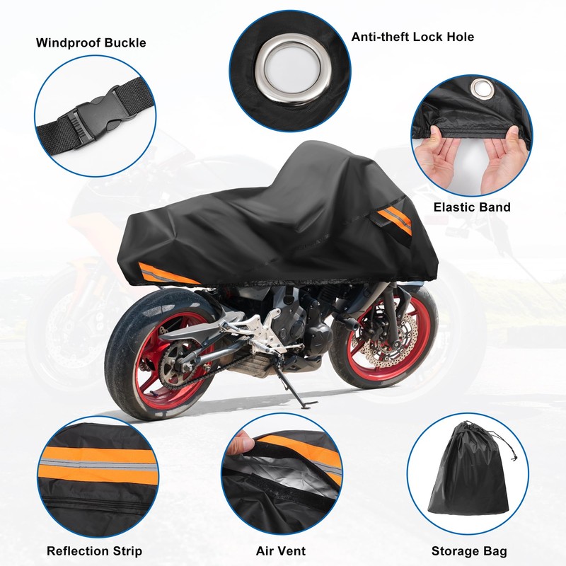 - Details Improvement: ①The surrounding night reflective strips protect your Motorcycle at night for security and easily find your motorbike. ②great breathable performance thanks to ventilation openings on the side. ③Lock Hole can be firmly fixed on the motorcycle. ④Complimentary storage bag.