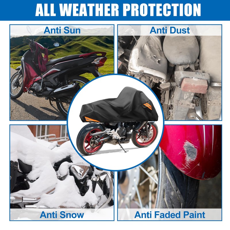 - All Weather 4 Season Protection: Rip-resistant material & advanced waterproof coatings for long term protection from rain, wind, sun & snow. Shields your motorcycle from bird poo, pollen, pine tar, leaves & dirt, so you can park it anywhere outside, even in the sun or under trees.