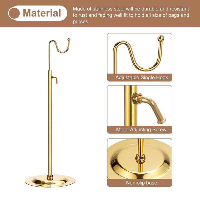 The purse stands with an adjustable height design, can fit your different purse display needs, use it for a tall handbags display, or small purse displays, the single hook can hold the bag more stable, can look more beautiful on display.