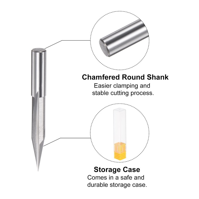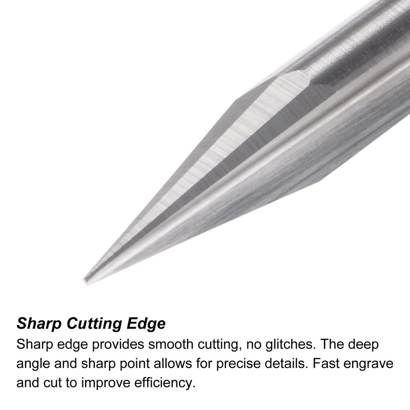 Sharp edges allow for smooth cutting and no glitch. Deep angle and sharp tip allow for precise detail. Carve and cut at high speed for increased efficiency. Designed with large shavings flute, faster shavings removal, and more efficient work