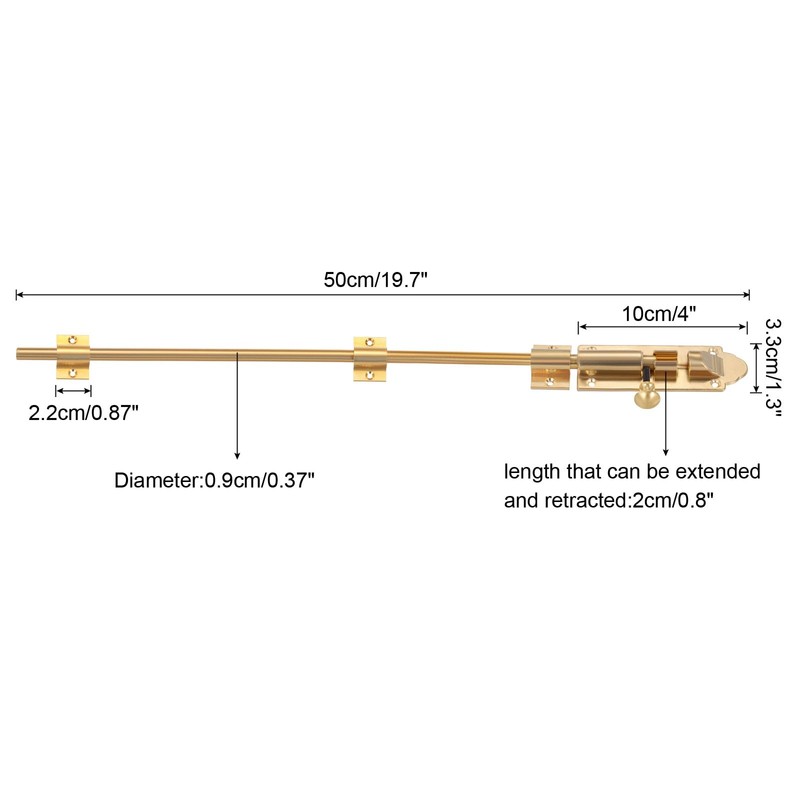 Description:Easy to Install: The Barrel Bolt Lock package includes screws and surface plates to ensure a seamless fit to any surface. To install, position the deadbolt on the door or piece of furniture where you want it to go. Secure it in place with the supplied screws, ensuring a tight fit for optimum functionality.Versatile Application: These Vintage Copper barrel bolt buckles add a vintage charm to your living space or restoration projects. This multipurpose bolt is suitable for securing doors, pet doors, cabinet furniture, windows, bathroom/bedroom doors, and fence doors, providing peace of mind and enhancing the overall aesthetics of your space.Enhance Safety: The Barrel Bolt Latch increases security and privacy in your home. It provides your child with a safe locking mechanism for doors, cupboards or furniture and is suitable for young children who are tall enough to reach the door handle but not yet strong enough to unlock it.Vintage Design and Quality Material: The vintage copper barrel bolt buckle is crafted from high-strength brass. Its solid brass construction ensures durability and longevity, making it a versatile and timeless addition to your decor.Notes: When installing the barrel bolt buckle, make sure to align it properly and securely fasten it with the screws to prevent any movement or instability. Regularly check the hardware to ensure it remains secure and functions correctly.SpecificationColor: BrassMaterial: CopperTotal Size: 3 x 10cm/1.2 x 4" (W*L)Packaging: 1Pcs Copper Barrel Bolt Buckle