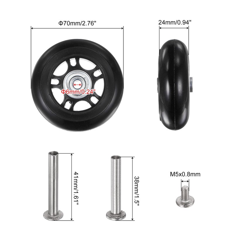 - Reasonable Size: Each luggage wheel measures 70mm/2.76" in outside diameter, the inner diameter is about 6mm/0.24", and the depth is 24mm/0.94". The screw size is M5x0.8mm.