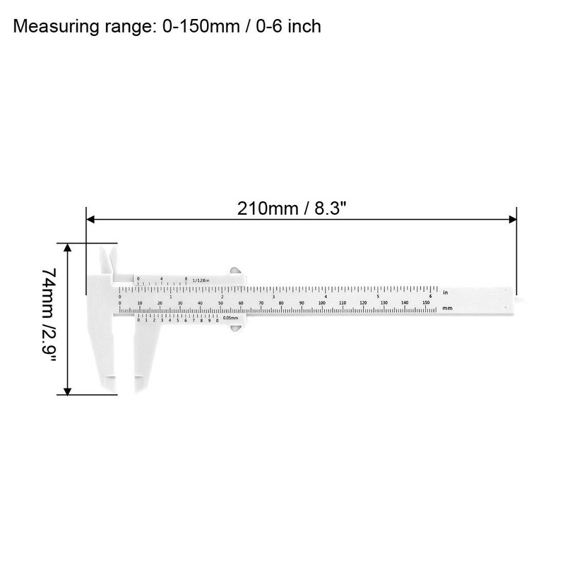 - Material: Plastic; Measuring range: 0-150mm; Total Size: 210 x 74 x 6mm / 8.3" x 2.9" x 0.2" (L*W*H) The precision of this vernier caliper is 0.05mm.