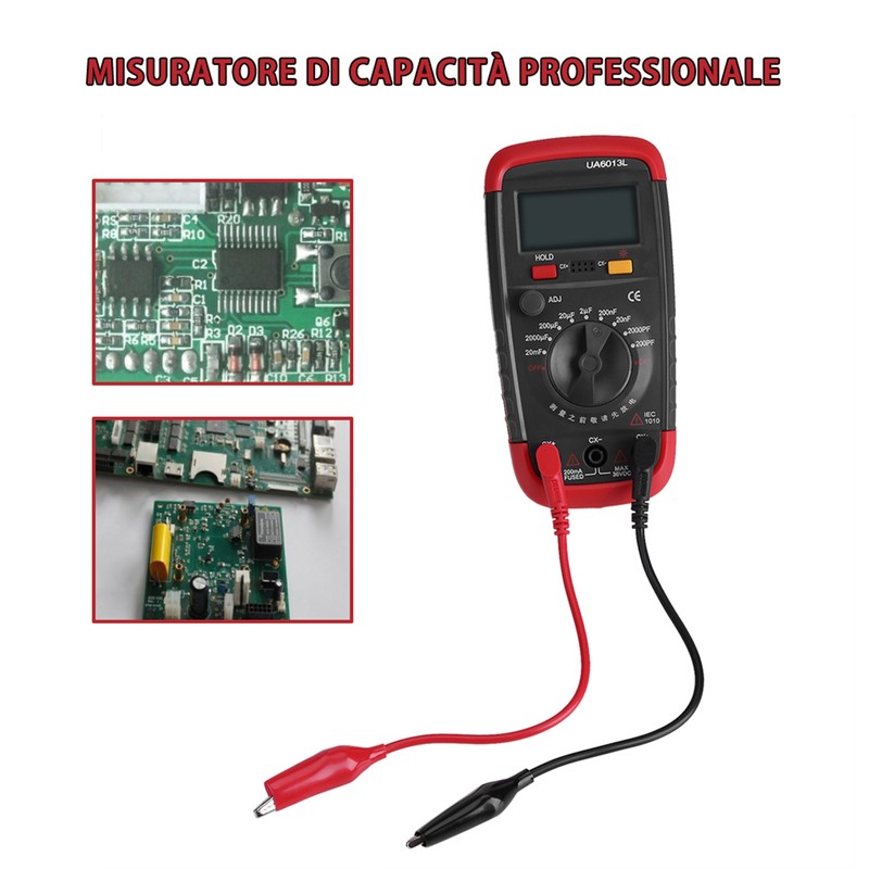 The digital capacitance meter 6013L is a novel handheld LCD display capacitive table that can be used to measure 9 range of data over a wide range from 0.1 pF to 20,000 uF.