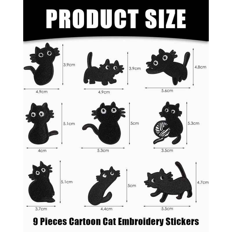 - Widely Used 9 pieces black cat iron on patches, perfect for T-shirts, skirts, jeans, vests, hats, backpacks, clothes, curtains, pillows, scarves, quilts and more. Ideal for decorating or mending clothes, perfect for handmade arts and crafts projects.