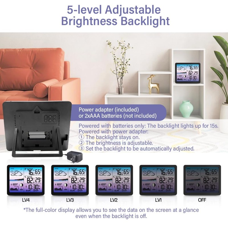 - 7.4” Colorful Display & Adjustable Backlight: EM3566D Weather Station features a large and vibrant HTN screen, providing a clear display of weather information from multiple angles. The backlight can be adjusted to 4 levels as needed, it can also be set to automatically adjust its brightness with the light. To save power, the screen only stay on when the home weather station is plugged into power adapter