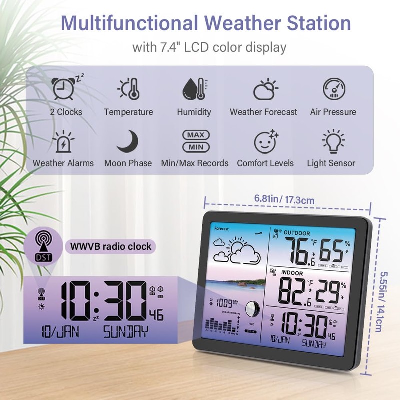 Uzoli EM3566D Weather Station Wireless Indoor Outdoor, 7.4in Home Weather Station with Atomic Clock, Temperature, Humidity, Weather Forecast, Moon Phase, Indoor Outdoor Thermometer with Large Display