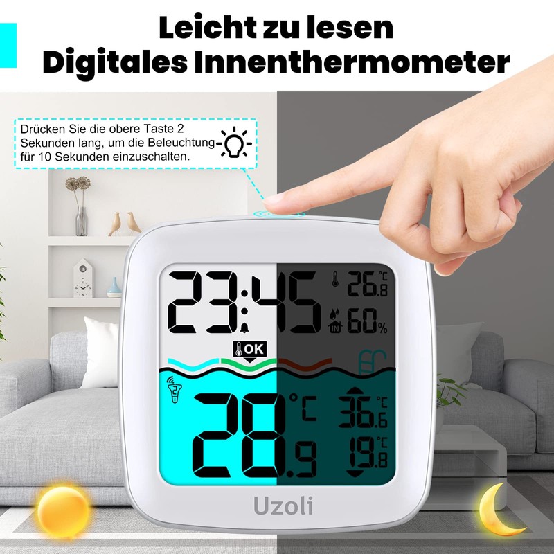 - 1. [All information at a glance] The base station can display the room temperature and humidity as well as the water temperature measured by the pool sensor, with an intelligent evaluation of the comfort level of the water. So you can observe the water temperature of the outdoor pool indoors and plan your swimming in advance. The base station also has a backlight, so that the values can not be easily read even in very bright light.